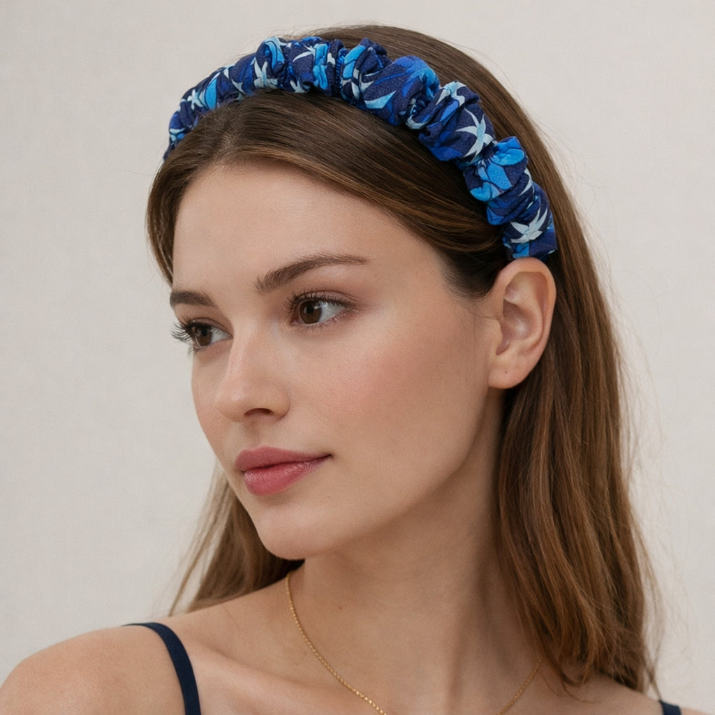 Finish your look with the Aziz scrunchie headband. This headband is crafted in our London studio from the fabric remnants from our clothing production.
