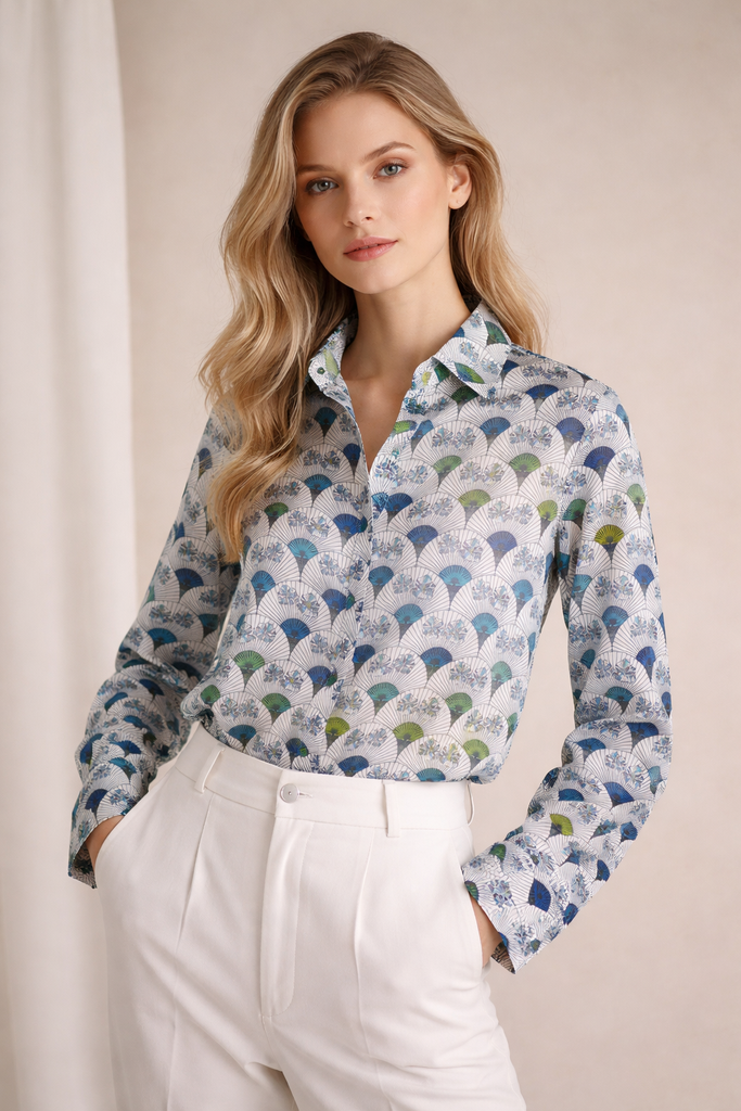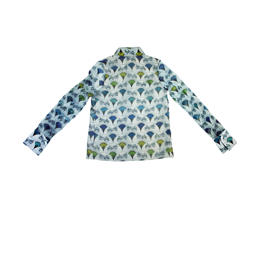 The Asuka Shirt is crafted from delicate printed organza inspired by the elegant shapes and patterns of traditional Japanese fans. A smooth white satin layer underneath adds coverage and contrast, highlighting the intricate design while creating a refined, structured silhouette. Lightweight and distinctive, the shirt blends artistic inspiration with modern elegance.